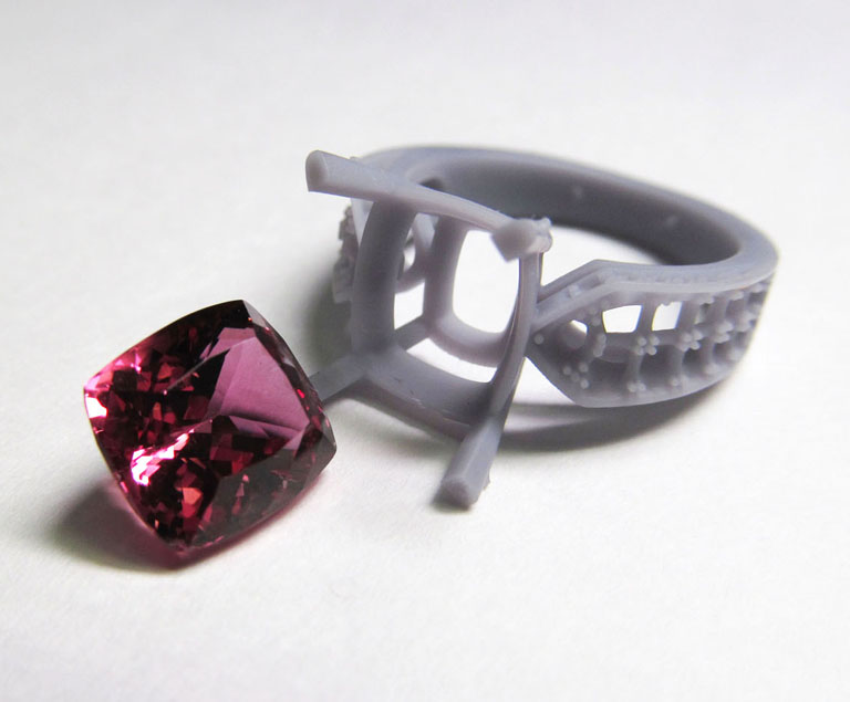 CADデータから3Dプリンターで樹脂モデルを造形し、それを鋳造してシルバー原型を作ります。この原型は、すべてのジュエリーの基準となる“原点”。石留めや磨きなど後の作業を見据えた構造設計を行い、GEMS独自のノウハウが息づく最も重要な工程です。